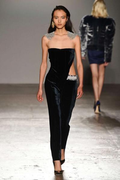 Segni Particolari: Il focus della collezione, è sulle spalle i cui volumi si accentuano, mentre le vite di giacche e cappotti si assottigliano. La silhuette è allungata, con i pantaloni dal taglio asciutto che si stringono alle caviglie con ghette. Eleganti e sofisticati pizzi, svelano disegni Decò e il logo costituito da una maxi “G” in Swarowski. Le spalline e le giacche si impreziosiscono di gioielli, mentre ricami con filo lurex, ricreano movimenti su abiti dai toni dell’oro, bianco e nero.