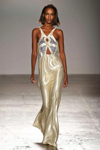 Segni Particolari: Il focus della collezione, è sulle spalle i cui volumi si accentuano, mentre le vite di giacche e cappotti si assottigliano. La silhuette è allungata, con i pantaloni dal taglio asciutto che si stringono alle caviglie con ghette. Eleganti e sofisticati pizzi, svelano disegni Decò e il logo costituito da una maxi “G” in Swarowski. Le spalline e le giacche si impreziosiscono di gioielli, mentre ricami con filo lurex, ricreano movimenti su abiti dai toni dell’oro, bianco e nero.