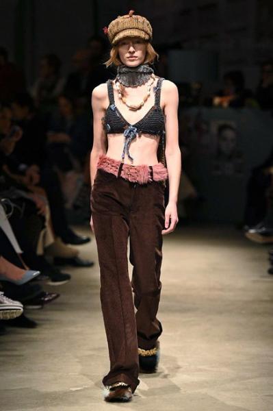 Segni Particolari: Ad una donna determinata, sicura di sé e con uno sguardo agli anni Quaranta è indirizzata la nuova collezione Prada. Una donna che può permettersi gli accostamenti più disparati, che indossa con nonchalance la parte di sopra del bikini durante le stagioni fredde con sopra il cappotto, un cardigan o anche senza, che è femminile e non rinuncia ai colori e all’eleganza. La predilezione è per lo più per le gonne che coprono il ginocchio e sono strette o svasate all’orlo. I capispalla sono lunghi cappotti di pelliccia, di pelle, giacche dalle grandi tasche, cardigan di lana di ispirazione retrò. Grande protagonista è il dettaglio: frange; borchie; inserti di piume che diventano orli di gonne, abiti e cappotti; stampe floreali o serigrafie di icone del cinema di un tempo; ricami di fiori.