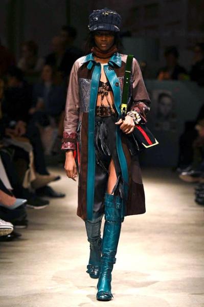 Segni Particolari: Ad una donna determinata, sicura di sé e con uno sguardo agli anni Quaranta è indirizzata la nuova collezione Prada. Una donna che può permettersi gli accostamenti più disparati, che indossa con nonchalance la parte di sopra del bikini durante le stagioni fredde con sopra il cappotto, un cardigan o anche senza, che è femminile e non rinuncia ai colori e all’eleganza. La predilezione è per lo più per le gonne che coprono il ginocchio e sono strette o svasate all’orlo. I capispalla sono lunghi cappotti di pelliccia, di pelle, giacche dalle grandi tasche, cardigan di lana di ispirazione retrò. Grande protagonista è il dettaglio: frange; borchie; inserti di piume che diventano orli di gonne, abiti e cappotti; stampe floreali o serigrafie di icone del cinema di un tempo; ricami di fiori.