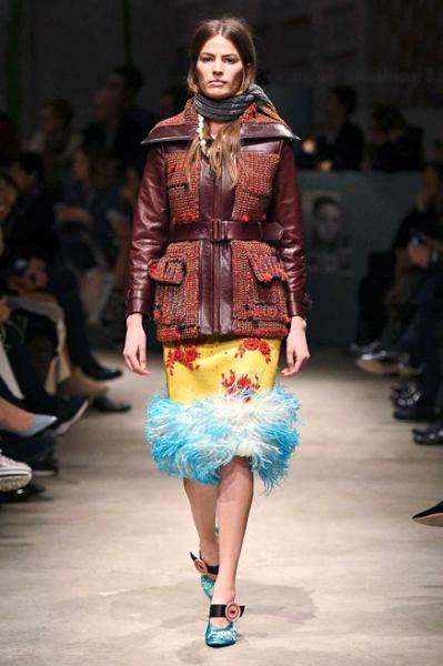 Segni Particolari: Ad una donna determinata, sicura di sé e con uno sguardo agli anni Quaranta è indirizzata la nuova collezione Prada. Una donna che può permettersi gli accostamenti più disparati, che indossa con nonchalance la parte di sopra del bikini durante le stagioni fredde con sopra il cappotto, un cardigan o anche senza, che è femminile e non rinuncia ai colori e all’eleganza. La predilezione è per lo più per le gonne che coprono il ginocchio e sono strette o svasate all’orlo. I capispalla sono lunghi cappotti di pelliccia, di pelle, giacche dalle grandi tasche, cardigan di lana di ispirazione retrò. Grande protagonista è il dettaglio: frange; borchie; inserti di piume che diventano orli di gonne, abiti e cappotti; stampe floreali o serigrafie di icone del cinema di un tempo; ricami di fiori.