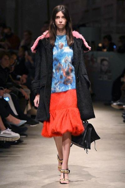 Segni Particolari: Ad una donna determinata, sicura di sé e con uno sguardo agli anni Quaranta è indirizzata la nuova collezione Prada. Una donna che può permettersi gli accostamenti più disparati, che indossa con nonchalance la parte di sopra del bikini durante le stagioni fredde con sopra il cappotto, un cardigan o anche senza, che è femminile e non rinuncia ai colori e all’eleganza. La predilezione è per lo più per le gonne che coprono il ginocchio e sono strette o svasate all’orlo. I capispalla sono lunghi cappotti di pelliccia, di pelle, giacche dalle grandi tasche, cardigan di lana di ispirazione retrò. Grande protagonista è il dettaglio: frange; borchie; inserti di piume che diventano orli di gonne, abiti e cappotti; stampe floreali o serigrafie di icone del cinema di un tempo; ricami di fiori.