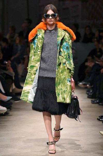 Segni Particolari: Ad una donna determinata, sicura di sé e con uno sguardo agli anni Quaranta è indirizzata la nuova collezione Prada. Una donna che può permettersi gli accostamenti più disparati, che indossa con nonchalance la parte di sopra del bikini durante le stagioni fredde con sopra il cappotto, un cardigan o anche senza, che è femminile e non rinuncia ai colori e all’eleganza. La predilezione è per lo più per le gonne che coprono il ginocchio e sono strette o svasate all’orlo. I capispalla sono lunghi cappotti di pelliccia, di pelle, giacche dalle grandi tasche, cardigan di lana di ispirazione retrò. Grande protagonista è il dettaglio: frange; borchie; inserti di piume che diventano orli di gonne, abiti e cappotti; stampe floreali o serigrafie di icone del cinema di un tempo; ricami di fiori.