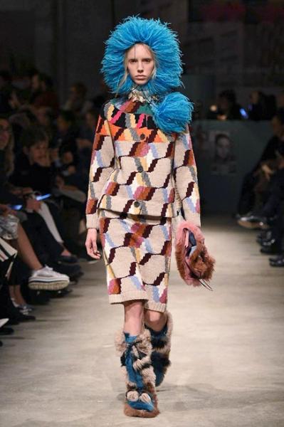 Segni Particolari: Ad una donna determinata, sicura di sé e con uno sguardo agli anni Quaranta è indirizzata la nuova collezione Prada. Una donna che può permettersi gli accostamenti più disparati, che indossa con nonchalance la parte di sopra del bikini durante le stagioni fredde con sopra il cappotto, un cardigan o anche senza, che è femminile e non rinuncia ai colori e all’eleganza. La predilezione è per lo più per le gonne che coprono il ginocchio e sono strette o svasate all’orlo. I capispalla sono lunghi cappotti di pelliccia, di pelle, giacche dalle grandi tasche, cardigan di lana di ispirazione retrò. Grande protagonista è il dettaglio: frange; borchie; inserti di piume che diventano orli di gonne, abiti e cappotti; stampe floreali o serigrafie di icone del cinema di un tempo; ricami di fiori.