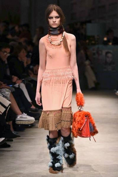 Segni Particolari: Ad una donna determinata, sicura di sé e con uno sguardo agli anni Quaranta è indirizzata la nuova collezione Prada. Una donna che può permettersi gli accostamenti più disparati, che indossa con nonchalance la parte di sopra del bikini durante le stagioni fredde con sopra il cappotto, un cardigan o anche senza, che è femminile e non rinuncia ai colori e all’eleganza. La predilezione è per lo più per le gonne che coprono il ginocchio e sono strette o svasate all’orlo. I capispalla sono lunghi cappotti di pelliccia, di pelle, giacche dalle grandi tasche, cardigan di lana di ispirazione retrò. Grande protagonista è il dettaglio: frange; borchie; inserti di piume che diventano orli di gonne, abiti e cappotti; stampe floreali o serigrafie di icone del cinema di un tempo; ricami di fiori.
