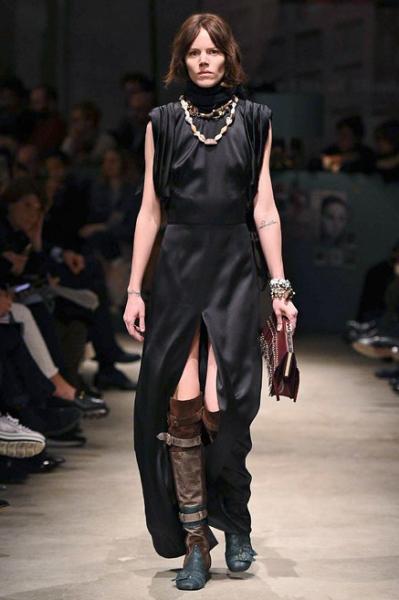 Segni Particolari: Ad una donna determinata, sicura di sé e con uno sguardo agli anni Quaranta è indirizzata la nuova collezione Prada. Una donna che può permettersi gli accostamenti più disparati, che indossa con nonchalance la parte di sopra del bikini durante le stagioni fredde con sopra il cappotto, un cardigan o anche senza, che è femminile e non rinuncia ai colori e all’eleganza. La predilezione è per lo più per le gonne che coprono il ginocchio e sono strette o svasate all’orlo. I capispalla sono lunghi cappotti di pelliccia, di pelle, giacche dalle grandi tasche, cardigan di lana di ispirazione retrò. Grande protagonista è il dettaglio: frange; borchie; inserti di piume che diventano orli di gonne, abiti e cappotti; stampe floreali o serigrafie di icone del cinema di un tempo; ricami di fiori.