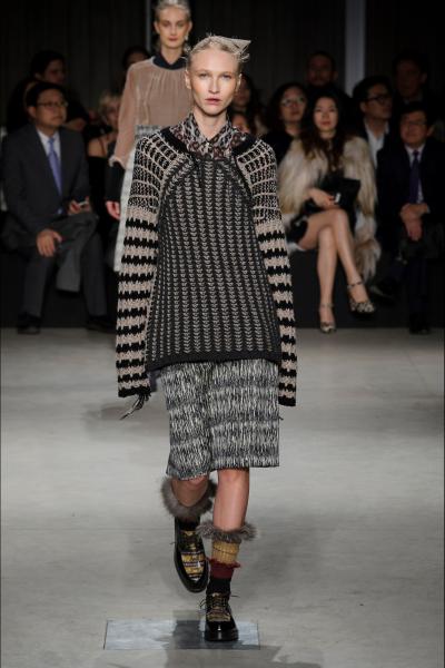 Segni Particolari: Sovrapposizioni giocate, texture e colori. L’animalier viene abbinato alle stampe astratte, alle lavorazioni dal forte effetto grafico. Spuntano polsini extra-long, sobri colletti, maglioni lunghi come mini-dress, mentre le gonne e i pantaloni hanno tagli morbidi. Forme dritte e morbide su tessuti come la lana, il velluto, il pizzo, il cotone e  la pelliccia.