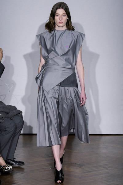 Segni Particolari: Quella di Gabriele Colangelo è una collezione basata su tagli di gusto maschile insieme a strutture creative che si poggiano sulla figura del rettangolo; su ogni capo, quindi, si osserva il leitmotiv geometrico che lavora su check micro e macro, lasciano spazio ad un’immagine “pulita” e, comunque, improntata alla ricerca della femminilità. La collezione è ricca di cappotti oversize, abiti longuette plissettati, pantaloni a vita alta oppure dalla stravagante allacciatura anteriore, giacche, cappe e jacquard con tagli sempre asimmetrici e dalle linee molto morbide; pellicce e stole avvolgenti.