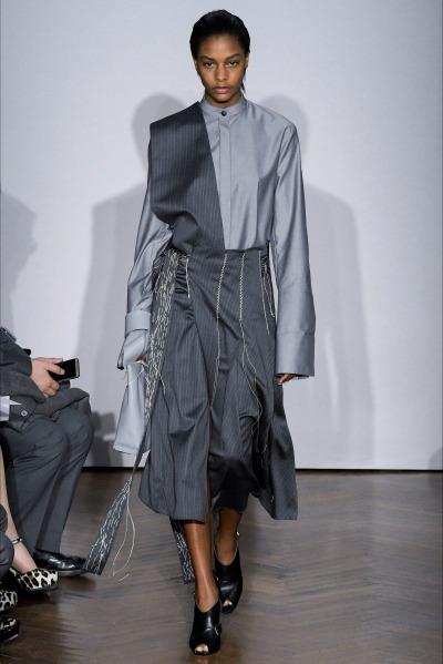 Segni Particolari: Quella di Gabriele Colangelo è una collezione basata su tagli di gusto maschile insieme a strutture creative che si poggiano sulla figura del rettangolo; su ogni capo, quindi, si osserva il leitmotiv geometrico che lavora su check micro e macro, lasciano spazio ad un’immagine “pulita” e, comunque, improntata alla ricerca della femminilità. La collezione è ricca di cappotti oversize, abiti longuette plissettati, pantaloni a vita alta oppure dalla stravagante allacciatura anteriore, giacche, cappe e jacquard con tagli sempre asimmetrici e dalle linee molto morbide; pellicce e stole avvolgenti.
