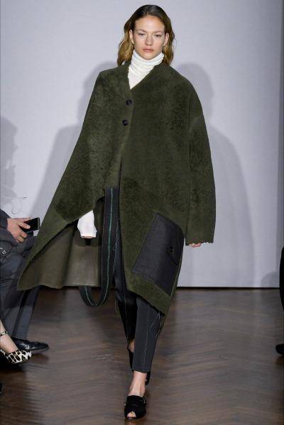 Segni Particolari: Quella di Gabriele Colangelo è una collezione basata su tagli di gusto maschile insieme a strutture creative che si poggiano sulla figura del rettangolo; su ogni capo, quindi, si osserva il leitmotiv geometrico che lavora su check micro e macro, lasciano spazio ad un’immagine “pulita” e, comunque, improntata alla ricerca della femminilità. La collezione è ricca di cappotti oversize, abiti longuette plissettati, pantaloni a vita alta oppure dalla stravagante allacciatura anteriore, giacche, cappe e jacquard con tagli sempre asimmetrici e dalle linee molto morbide; pellicce e stole avvolgenti.