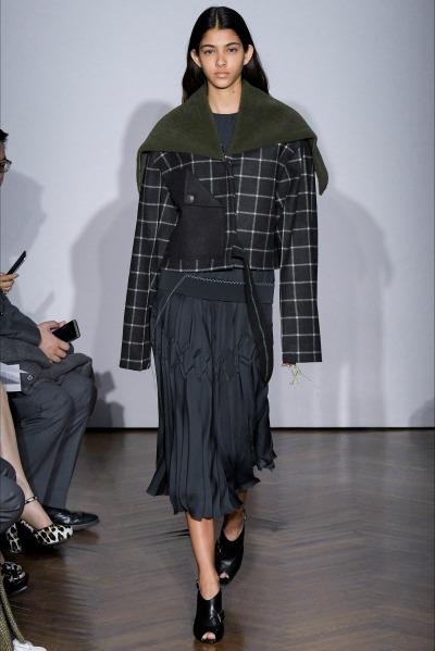 Segni Particolari: Quella di Gabriele Colangelo è una collezione basata su tagli di gusto maschile insieme a strutture creative che si poggiano sulla figura del rettangolo; su ogni capo, quindi, si osserva il leitmotiv geometrico che lavora su check micro e macro, lasciano spazio ad un’immagine “pulita” e, comunque, improntata alla ricerca della femminilità. La collezione è ricca di cappotti oversize, abiti longuette plissettati, pantaloni a vita alta oppure dalla stravagante allacciatura anteriore, giacche, cappe e jacquard con tagli sempre asimmetrici e dalle linee molto morbide; pellicce e stole avvolgenti.