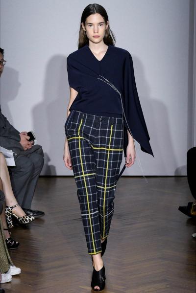 Segni Particolari: Quella di Gabriele Colangelo è una collezione basata su tagli di gusto maschile insieme a strutture creative che si poggiano sulla figura del rettangolo; su ogni capo, quindi, si osserva il leitmotiv geometrico che lavora su check micro e macro, lasciano spazio ad un’immagine “pulita” e, comunque, improntata alla ricerca della femminilità. La collezione è ricca di cappotti oversize, abiti longuette plissettati, pantaloni a vita alta oppure dalla stravagante allacciatura anteriore, giacche, cappe e jacquard con tagli sempre asimmetrici e dalle linee molto morbide; pellicce e stole avvolgenti.