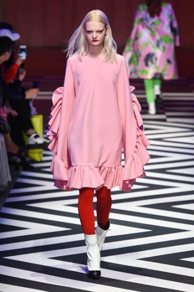 Segni Particolari: Spazia tra atmosfere surreali, ricchissime di contrasti policromi e immagini ossessive di aquile con reminiscenze chevron miste ad ambienti da college, la collezione MSGM, straordinariamente accattivante e colma di spunti originali. Su tutto sempre la voglia di stupire senza mancare di salvaguardare la femminilità. In passerella sfilano abiti longuette con stampe geometriche a diagonali e floreali o a scacchi bianchi e neri, giubbotti e giacconi da college, maglioni con stampe evocanti motivi forestali, gonne longuette, completi pantaloni e abiti dalla pura linea classica spesso con romantici volant. Originali le pellicce che ricalcano i canoni dello stile adottato con varianti e cromie disparate.