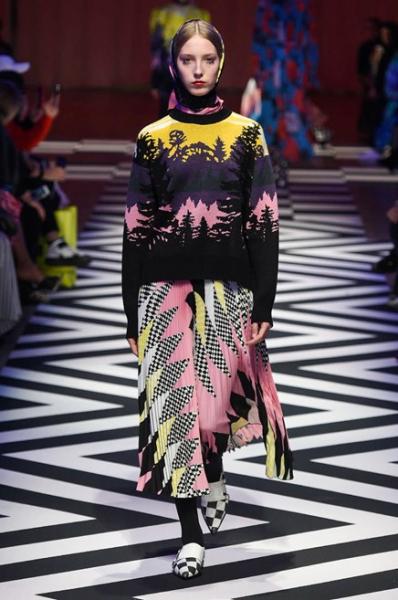 Segni Particolari: Spazia tra atmosfere surreali, ricchissime di contrasti policromi e immagini ossessive di aquile con reminiscenze chevron miste ad ambienti da college, la collezione MSGM, straordinariamente accattivante e colma di spunti originali. Su tutto sempre la voglia di stupire senza mancare di salvaguardare la femminilità. In passerella sfilano abiti longuette con stampe geometriche a diagonali e floreali o a scacchi bianchi e neri, giubbotti e giacconi da college, maglioni con stampe evocanti motivi forestali, gonne longuette, completi pantaloni e abiti dalla pura linea classica spesso con romantici volant. Originali le pellicce che ricalcano i canoni dello stile adottato con varianti e cromie disparate.