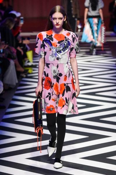 Segni Particolari: Spazia tra atmosfere surreali, ricchissime di contrasti policromi e immagini ossessive di aquile con reminiscenze chevron miste ad ambienti da college, la collezione MSGM, straordinariamente accattivante e colma di spunti originali. Su tutto sempre la voglia di stupire senza mancare di salvaguardare la femminilità. In passerella sfilano abiti longuette con stampe geometriche a diagonali e floreali o a scacchi bianchi e neri, giubbotti e giacconi da college, maglioni con stampe evocanti motivi forestali, gonne longuette, completi pantaloni e abiti dalla pura linea classica spesso con romantici volant. Originali le pellicce che ricalcano i canoni dello stile adottato con varianti e cromie disparate.