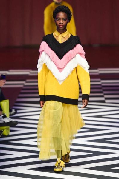 Segni Particolari: Spazia tra atmosfere surreali, ricchissime di contrasti policromi e immagini ossessive di aquile con reminiscenze chevron miste ad ambienti da college, la collezione MSGM, straordinariamente accattivante e colma di spunti originali. Su tutto sempre la voglia di stupire senza mancare di salvaguardare la femminilità. In passerella sfilano abiti longuette con stampe geometriche a diagonali e floreali o a scacchi bianchi e neri, giubbotti e giacconi da college, maglioni con stampe evocanti motivi forestali, gonne longuette, completi pantaloni e abiti dalla pura linea classica spesso con romantici volant. Originali le pellicce che ricalcano i canoni dello stile adottato con varianti e cromie disparate.
