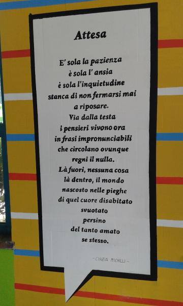 Meravigliosa artista, il cui talento, ha trovato la via dell’esternazione attraverso questo insolito canale. Altri suoi scritti si possono leggere dentro l’ex manicomio di Roma, il Santa Maria della Pietà (Progetto Caleidoscopio), alla stazione FS della Giustiniana, nell’ambito del progetto “Arte in stazione e Città a colori”. Ultimamente ha fatto esperimenti di “arte da rubare”, lasciando sue poesie incorniciate e abbandonate in molti angoli di Roma.