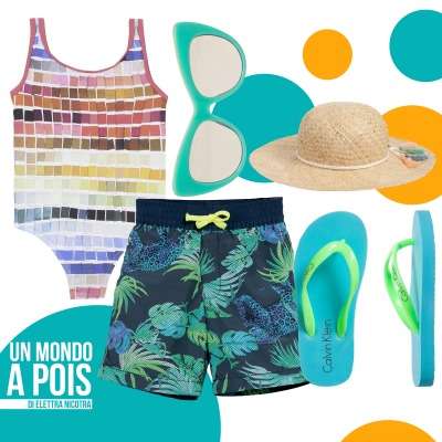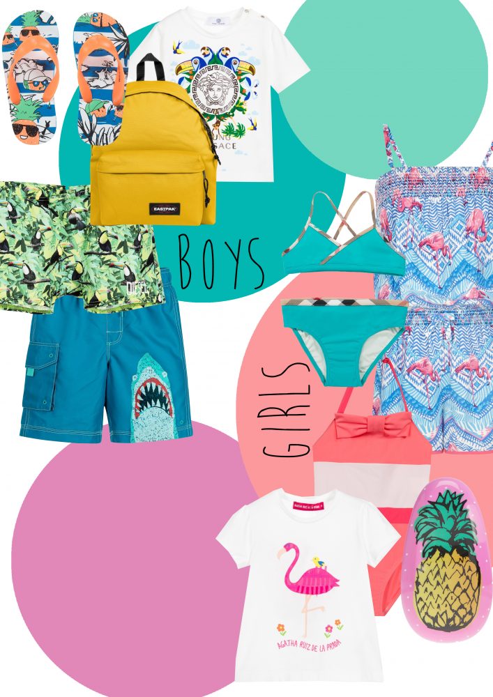 Shorts da spiaggia Hatley; costume con stampa tucano Diesel; flip-flops in gomma Billybandit; zaino in tela Eastpack; t-shirt con stampa Medusa Young Versace; jumpsuit stampa flamingo Monsoon; costume intero color block Lili Gaufrette; bikini con profilo stampa check Burberry; t-shirt stampa flamingo Agatha Ruiz De La Prada; spazzola per capelli con stampa ananas Accessorize.