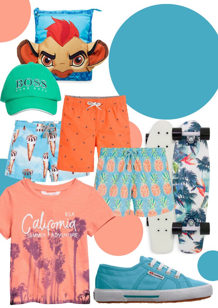 Borsa da spiaggia “The Lion Guard” Disney; costume shorts con stampa ice-cream MC2 St Barth; costume a pantaloncino Tommy Hilfiger; costume con stampa ananas Sunuva; t-shirt in jersey di cotone con stampa H&M; sneakers in tela Superga; skateboard “Paradise” Penny Boards.