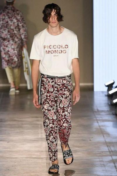 Segni Particolari: “C’è un po di Tadzio in Morte a Venezia [da Thomas Mann] nella collezione”, ha detto lo stilista. Ogni volta che ha bisogno di “trovare se stesso,” Christian Pellizzari torna alle sue radici, a Venezia in particolare e questa collezione è ispirata proprio alla città Italiana. Su shorts e giacche, ritroviamo i motivi architettonici di Piazza San Marco, gondole sulle t-shirt infine i mosaici della basilica di San Marco, sui tailleur scuri. Il simbolo della città, il leone, impreziosisce infine camicie e pantaloni.