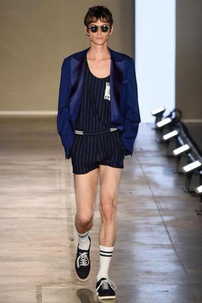 Segni Particolari: “C’è un po di Tadzio in Morte a Venezia [da Thomas Mann] nella collezione”, ha detto lo stilista. Ogni volta che ha bisogno di “trovare se stesso,” Christian Pellizzari torna alle sue radici, a Venezia in particolare e questa collezione è ispirata proprio alla città Italiana. Su shorts e giacche, ritroviamo i motivi architettonici di Piazza San Marco, gondole sulle t-shirt infine i mosaici della basilica di San Marco, sui tailleur scuri. Il simbolo della città, il leone, impreziosisce infine camicie e pantaloni.