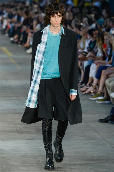 Segni Particolari: Il grunge degli anni Novanta, incontra gli skater e nasce una collezione dal sapore sport-tech. “Volevo una passerella come una vera e propria strada, ampia e lunga, in cui le persone si mescolano i propri codici”, ha detto Andreas Melbostad. Per la donna, abiti floreali, lunghi, maglieria a righe, gonne top-layer che volare dietro di loro come lunghi e leggeri strascichi. Camicie rubate dal guardaroba maschile e quadri, abbinate con pantaloni cargo over. Per l’uomo, lunghe camicie a scacchi, pantaloncini indossati su leggings bordati con strisce di tessuto colorato e infine, parka nero oversize. I classici capispalla, aggiornati in chiave moderna, sono stati il ​​punto di forza, giacche di pelle da motociclista, camicie di pelle nera, cappotti senza colletto e blouson neri voluminosi con fianchi elasticizzati e sportivi.