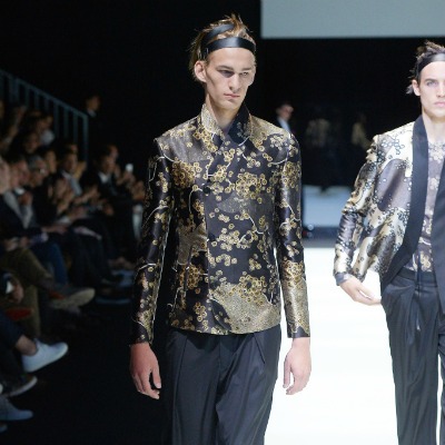 Pantaloni sorprendenti, ampi e voluttuosi che ricordano le arti marziali, con sopra, una gonna che si stacca o con enormi giochi di pieghe come quelli dei samurai o dei lottatori di sumo. Portati con giacche più corte, camicia e cravatta, quest’ultima con la punta giocosamente infilata nel taschino. “Ma per carità che non si dica che Armani ha messo la gonna agli uomini – dice l’immenso Giorgio -. I miei solo solo pantaloni ricchi con le pince e un bello sfondo piega“. In passerella inoltre disegni di pesci rossi sulla maglieria, fiori stampati come peonie o crisantemi. Infine, sete jacquard Chinoiserie, utilizzati su tutto, dai blazer alle giacche corte, fino ai parka.