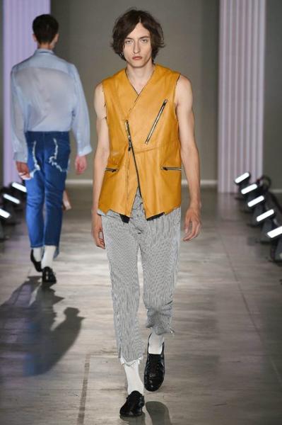 Segni Particolari: “8 min” è il nome della collezione primavera estate 2018 di Sulvam. In passerella, uomini e donne che portano il menswear sartoriale in una dimensione genderless originale. Il designer Teppei Fujita ha paragonato il suo processo di progettazione, basato su disegni di decostruzione, ad una “improv ome jam session” nella quale l’istinto e l’emozione sono i veri protagonisti. Giacche e pantaloni dai quali fuoriescono accenti di tessuto verniciati di contrasto in navy e avorio, tasche di denim tagliate in lana, pantaloni in pelle nera e senape con cerniere sul retro della gamba per regolarne il volume.