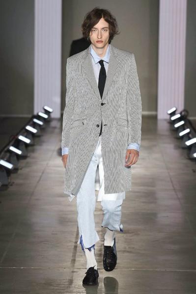 Segni Particolari: “8 min” è il nome della collezione primavera estate 2018 di Sulvam. In passerella, uomini e donne che portano il menswear sartoriale in una dimensione genderless originale. Il designer Teppei Fujita ha paragonato il suo processo di progettazione, basato su disegni di decostruzione, ad una “improv ome jam session” nella quale l’istinto e l’emozione sono i veri protagonisti. Giacche e pantaloni dai quali fuoriescono accenti di tessuto verniciati di contrasto in navy e avorio, tasche di denim tagliate in lana, pantaloni in pelle nera e senape con cerniere sul retro della gamba per regolarne il volume.