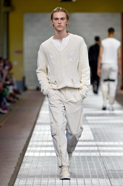 Segni Particolari: Lee Wood nuovo direttore creativo presenta, per questa collezione, abiti minimal mixati all’abbigliamento sportivo. Abiti funzionali, costituiti da pattern ripetuti in tutta la collezione, un’atmosfera quasi industriale che però lascia spazio ad una certa eleganza e leggerezza. Abiti di lino blu con bottoni, pantaloni con tasche cargo, lunghi cappotti con inserti in cuoio. Pantaloni slim in denim, pantaloni corti sportivi abbinati con giacche classiche ed eleganti su misura.