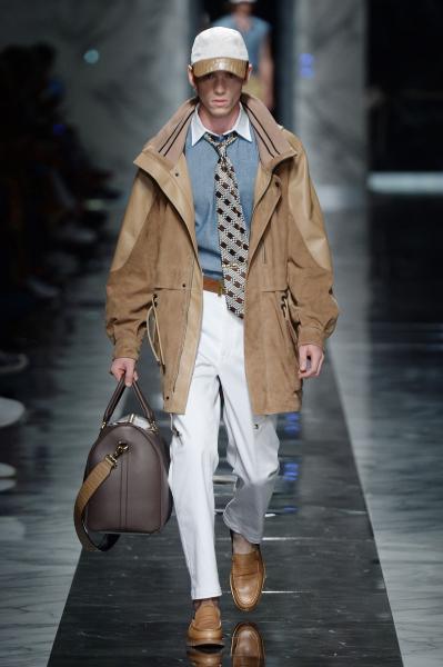 Segni Particolari: Una collezione divertente, pensata per chi vuole avere uno stile fresco ma allo stesso tempo elegante sul posto di lavoro. Silvia Fendi si preoccupa delle necessità delle generazioni future che probabilmente dovranno cambiare carriera migliaia di volte nella loro vita. “Si tratta di combinare aspetti diversi e di essere aperti al cambiamento“, ha dichiarato. Sonoabiti perfetti per condurre incontri di lavoro su Skype: maglia e giacca dalle linee pulite e sartoriali, abbinati a pantaloncini stile bermuda. Si passa dai classici modelli maschili presi dall’armadio di un dirigente nouveau riche dal gusto naif, all’abbigliamento sportivo. Bretelle, mocassini e cravatte di seta stampate, stampe di oggetti di uso quotidiano come tazze, lampade da tavolo, banane e chiavi.