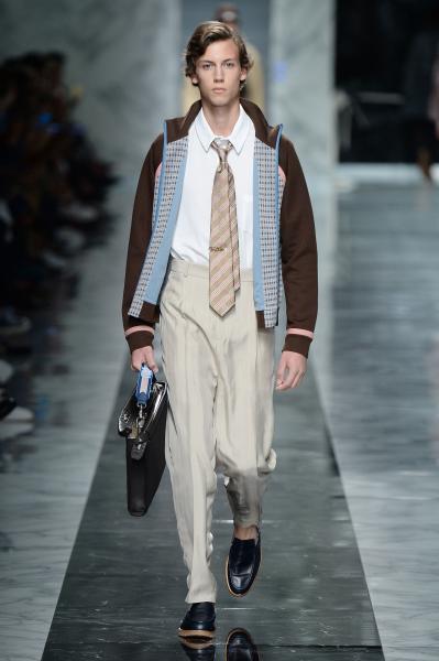 Segni Particolari: Una collezione divertente, pensata per chi vuole avere uno stile fresco ma allo stesso tempo elegante sul posto di lavoro. Silvia Fendi si preoccupa delle necessità delle generazioni future che probabilmente dovranno cambiare carriera migliaia di volte nella loro vita. “Si tratta di combinare aspetti diversi e di essere aperti al cambiamento“, ha dichiarato. Sonoabiti perfetti per condurre incontri di lavoro su Skype: maglia e giacca dalle linee pulite e sartoriali, abbinati a pantaloncini stile bermuda. Si passa dai classici modelli maschili presi dall’armadio di un dirigente nouveau riche dal gusto naif, all’abbigliamento sportivo. Bretelle, mocassini e cravatte di seta stampate, stampe di oggetti di uso quotidiano come tazze, lampade da tavolo, banane e chiavi.