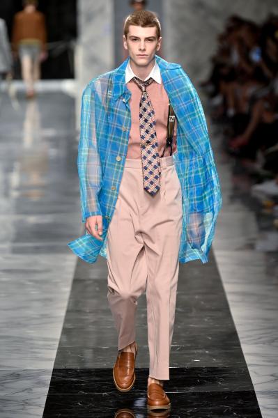 Segni Particolari: Una collezione divertente, pensata per chi vuole avere uno stile fresco ma allo stesso tempo elegante sul posto di lavoro. Silvia Fendi si preoccupa delle necessità delle generazioni future che probabilmente dovranno cambiare carriera migliaia di volte nella loro vita. “Si tratta di combinare aspetti diversi e di essere aperti al cambiamento“, ha dichiarato. Sonoabiti perfetti per condurre incontri di lavoro su Skype: maglia e giacca dalle linee pulite e sartoriali, abbinati a pantaloncini stile bermuda. Si passa dai classici modelli maschili presi dall’armadio di un dirigente nouveau riche dal gusto naif, all’abbigliamento sportivo. Bretelle, mocassini e cravatte di seta stampate, stampe di oggetti di uso quotidiano come tazze, lampade da tavolo, banane e chiavi.