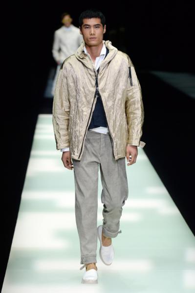 Segni Particolari: Una palette colori che comprende cinquanta sfumature di grigio chiaro. Nessuna scenografia artificiosa, solo una line bianca ad illuminare il centro della passerella. Giacche su misura dal taglio sartoriale, sagome che si ispirano all’Estremo Oriente e camicie avvolgenti stile pigiama. Nelle giacche dal taglio squadrato, colli a scialle o revers a punta stretta. Infine maglioni leggeri abbinati con pantaloni slim dal taglio classico. Tra i tessuti: jacquard e sete ultra leggere.