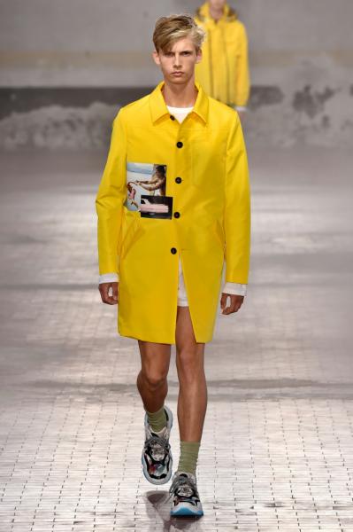 Segni Particolari: Alessandro Dell’Acqua presenta una collezione sporty-chic, ispirata dalle immagini del fotografo Bruce Weber. Il senso di libertà presente nelle immagini degli anni ’80 di Weber, hanno ispirato l’intera collezione che racconta un’estate gioiosa, sportiva ma allo stesso tempo chic. Parka sportivi rivestiti con tessuti metallici, maglie che riportano stampe di foto estive. Tocchi di vernice su cappotti e giubbotti dal taglio sartoriale, fiori tropicali su camicie di cotone e pantaloni di seta, indossati con camicie con motivi a strisce.