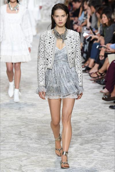 Parliamo del design cosmopolita di Etro che attraversa il globo con le sue stampe ispirate. 1968: epoca di sperimentazioni lisergiche, Flower Power e ricerca spirituale che portava i giovani fino in India alla ricerca del proprio Guru (vedi i Beatles!). Fra questi anche Gerolamo Etro che nello stesso anno fonda il suo marchio trasponendo il suo amore per questa terra speziata nella fantasia Paisley ormai simbolo della Mason. La sfilata è un crescendo che parte da outfit all-white incantevoli, con intarsi di cristalli, sete impalpabili, colli coreana e capispalla magici. Dai bianchi ai grigi fino al netto passaggio cromatico che vede in passerella i colori caldi irrinunciabili per i designers: terra bruciata, arancione, bordeaux, giallo. Patchwork intricati fatti di ricami e applicazioni su giacche bolero e gilet, maxi o mini dress fluidi stampati di paisley, pantaloni crotch con foulard annodati in vita e blazer oversize; per la sera un’elegante e colorata rivisitazione del sahari indiano in abiti lunghi monospalla.