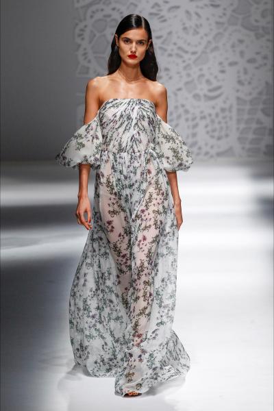 La sfilata della collezione primavera/estate 2018 è un crescendo che parte da mini pois con inserti in pizzo da nuova Lolita, ai quali si aggiunge man mano il colore delle violette, per poi partire alla volta dell’estremo oriente. Qui, la designer italiana, ci mostra tre modi di indossare il kimono: come minidress in stile coreano, in seta con shorts come fosse un elegantissimo pigiama o aperto a vestaglia su abiti négligé. Un gioco di volant, arricciature e linee vittoriane rendono fresco un abito nero con stampa floreale, e, quest’ultima si trasmuta ancora per diventare un ricamo su tulle trasparente a pois. Il nightwear da indossare per donne audaci, ma sempre aggraziate e glamour, con vestaglie in paillettes ed abiti sottana.