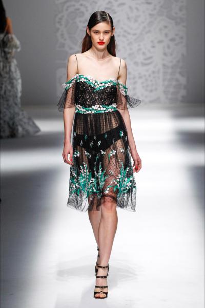 La sfilata della collezione primavera/estate 2018 è un crescendo che parte da mini pois con inserti in pizzo da nuova Lolita, ai quali si aggiunge man mano il colore delle violette, per poi partire alla volta dell’estremo oriente. Qui, la designer italiana, ci mostra tre modi di indossare il kimono: come minidress in stile coreano, in seta con shorts come fosse un elegantissimo pigiama o aperto a vestaglia su abiti négligé. Un gioco di volant, arricciature e linee vittoriane rendono fresco un abito nero con stampa floreale, e, quest’ultima si trasmuta ancora per diventare un ricamo su tulle trasparente a pois. Il nightwear da indossare per donne audaci, ma sempre aggraziate e glamour, con vestaglie in paillettes ed abiti sottana.