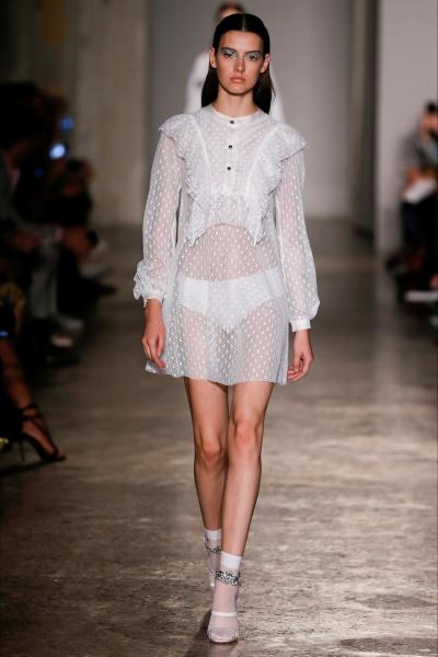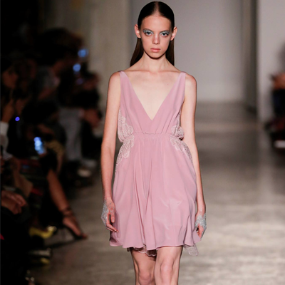 Segni Particolari: una donna dallo spirito delicato e inquieto è quella portata in passerella da Francesco Scognamiglio, una donna libera, ed eclettica.  Mini abiti rosa con ruche décor, ma anche felpe e T-shirt over con stampe dai colori accessi. Coat piumati e maxi bomber lamé. Una donna che ama il mix and match, i contrasti forti e i colori. Allo stesso tempo una donna sexy che indossa abiti in stile Eighties e dress di pizzo trasparenti.