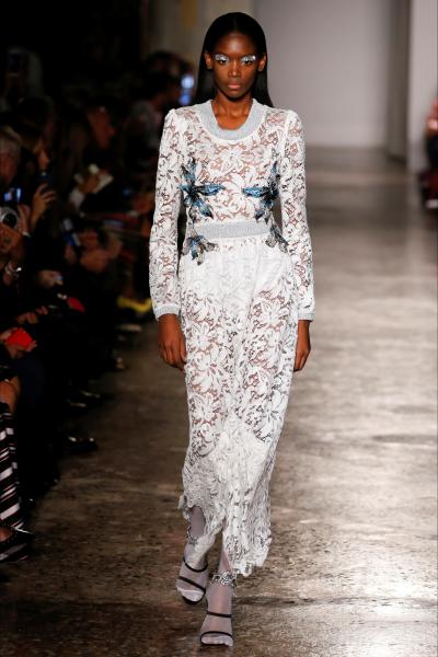 Segni Particolari: una donna dallo spirito delicato e inquieto è quella portata in passerella da Francesco Scognamiglio, una donna libera, ed eclettica.  Mini abiti rosa con ruche décor, ma anche felpe e T-shirt over con stampe dai colori accessi. Coat piumati e maxi bomber lamé. Una donna che ama il mix and match, i contrasti forti e i colori. Allo stesso tempo una donna sexy che indossa abiti in stile Eighties e dress di pizzo trasparenti.