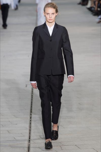 La loro estetica risulta perfettamente conforme a quella del marchio. Quasi tutta la sfilata ruota attorno un capo basic dell’abbigliamento: la camicia bianca. Viene tradotta in maxi dress, in blusa, in jumpsuit o arricchita da lunghissime frange o maniche baloon. Altro elemento chiave sono i capispalla, notevoli i blazer dei completi maschili, ma soprattutto i cappotti classici, come quello cammello. Pezzi da guardaroba per i quali vale la pena spendere, non rivoluzioni di stile. Un elemento che desta interesse è il modo in cui, tramite le arricciature degli abiti, si riesca a rendere sinuoso un pattern geometrico a rombi privandolo della sua rigidità. A conclusione dello show, alcuni abiti colour block dallo stile bohémien in maglia larga.