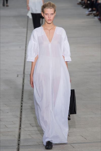 La loro estetica risulta perfettamente conforme a quella del marchio. Quasi tutta la sfilata ruota attorno un capo basic dell’abbigliamento: la camicia bianca. Viene tradotta in maxi dress, in blusa, in jumpsuit o arricchita da lunghissime frange o maniche baloon. Altro elemento chiave sono i capispalla, notevoli i blazer dei completi maschili, ma soprattutto i cappotti classici, come quello cammello. Pezzi da guardaroba per i quali vale la pena spendere, non rivoluzioni di stile. Un elemento che desta interesse è il modo in cui, tramite le arricciature degli abiti, si riesca a rendere sinuoso un pattern geometrico a rombi privandolo della sua rigidità. A conclusione dello show, alcuni abiti colour block dallo stile bohémien in maglia larga.