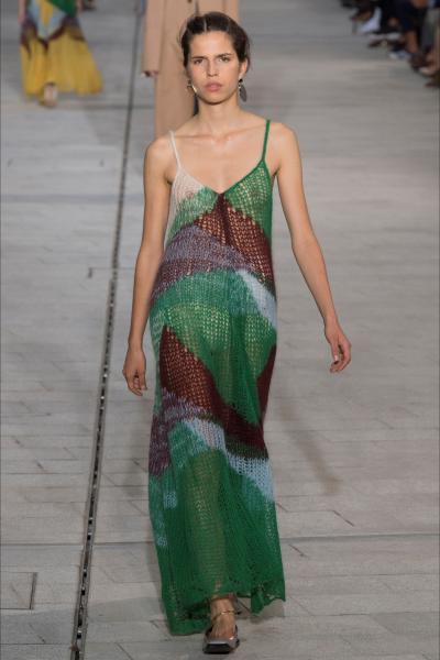 La loro estetica risulta perfettamente conforme a quella del marchio. Quasi tutta la sfilata ruota attorno un capo basic dell’abbigliamento: la camicia bianca. Viene tradotta in maxi dress, in blusa, in jumpsuit o arricchita da lunghissime frange o maniche baloon. Altro elemento chiave sono i capispalla, notevoli i blazer dei completi maschili, ma soprattutto i cappotti classici, come quello cammello. Pezzi da guardaroba per i quali vale la pena spendere, non rivoluzioni di stile. Un elemento che desta interesse è il modo in cui, tramite le arricciature degli abiti, si riesca a rendere sinuoso un pattern geometrico a rombi privandolo della sua rigidità. A conclusione dello show, alcuni abiti colour block dallo stile bohémien in maglia larga.