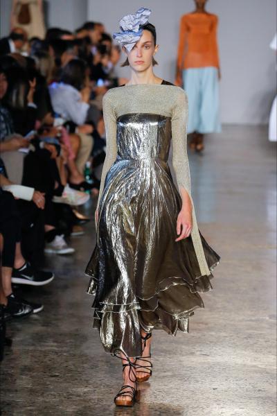 Segni Particolari: lo stilista sottrae, divide, ibrida ed aggiunge. Guarda agli anni Cinquanta degli atelier, trovando l’equilibrio nella asimmetria e in un’idea di ribellione gentile, tra teddy girl e suffragette. Silhouette aggraziate e tridimensionali, vite alte segnate da cinture e corde, pantaloni a fuso e camicie che diventano abiti. La materia è la vera protagonista, oro e rame nella maglieria e nei tessuti metallici, tela grezza cotone, camiceria, tela denim, sete fluide.