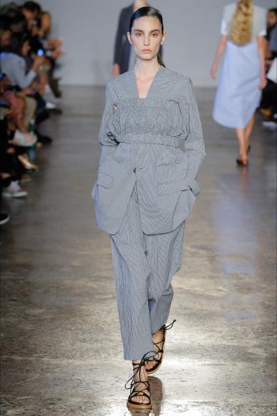 Segni Particolari: lo stilista sottrae, divide, ibrida ed aggiunge. Guarda agli anni Cinquanta degli atelier, trovando l’equilibrio nella asimmetria e in un’idea di ribellione gentile, tra teddy girl e suffragette. Silhouette aggraziate e tridimensionali, vite alte segnate da cinture e corde, pantaloni a fuso e camicie che diventano abiti. La materia è la vera protagonista, oro e rame nella maglieria e nei tessuti metallici, tela grezza cotone, camiceria, tela denim, sete fluide.