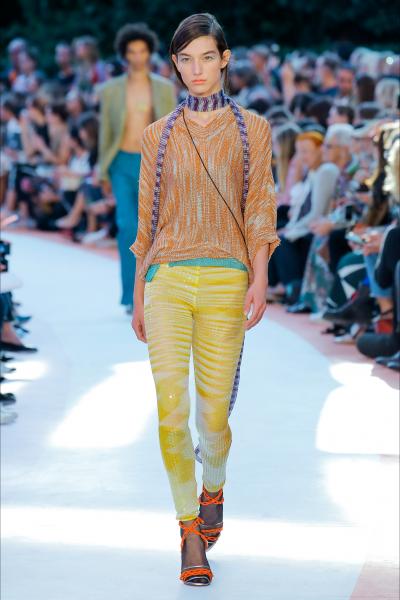 Fuori da ogni aspettativa, non è un fashion show stracolmo di zig-zag, anzi, di questo solo un accenno in una leggera mantella bianca ed in qualche uscita maschile. La nuova donna Missoni è super sexy con abiti see through in rete di maglia, scollature a v profondissime, plissettati degradè, very mini jumpsuits in maglia, maxi cardigan intramontabili, leggings e maglieria in tessuto mélange. Lurex su abiti trasparenti e jumpsuits, le iconiche mini righe su panta palazzo a vita alta, crop top e lunghi abiti ricamati. È una collezione estremamente tattile per i suoi tessuti goffrati, i pizzi ricamati o le applicazioni di cristalli Swarovski.