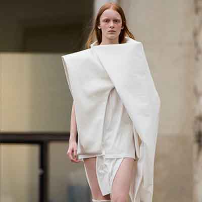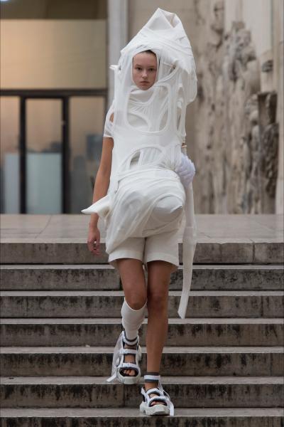 Tessuti drappeggiati e avvolti intorno al corpo che, danno vita a forme astratte dai colori bianco, nero, verde e grigio. Una visione complessa e stratificata che si avvicina sempre più ai più grandi creativi giapponesi e, come tutti i veri artisti, il significato delle sue creazioni resta misterioso e sconosciuto. Tra tutti i presenti, genera un senso di meraviglia e stupore, dato anche dalla bellezza della location e dalla maestosità dello spettacolo così teatrale come sono solite essere tutte le ultime produzioni di Owens. Sneakers e sandali con suola in gomma, completano l’outfit.