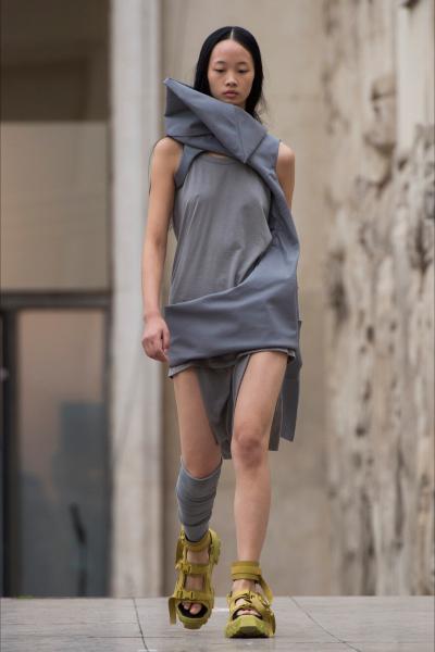 Tessuti drappeggiati e avvolti intorno al corpo che, danno vita a forme astratte dai colori bianco, nero, verde e grigio. Una visione complessa e stratificata che si avvicina sempre più ai più grandi creativi giapponesi e, come tutti i veri artisti, il significato delle sue creazioni resta misterioso e sconosciuto. Tra tutti i presenti, genera un senso di meraviglia e stupore, dato anche dalla bellezza della location e dalla maestosità dello spettacolo così teatrale come sono solite essere tutte le ultime produzioni di Owens. Sneakers e sandali con suola in gomma, completano l’outfit.