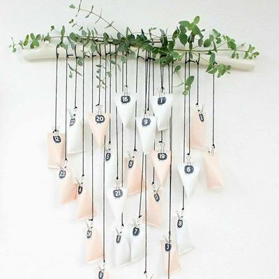 Una cascata di cofanetti color crema, pendenti da un ramo bianco con steli di erba verde, può contenere pensieri e doni di valore. Un calendario dell’avvento luxury ideale per case dallo stile scandinavo.