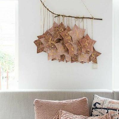 Legno naturale e stelle rosé con numeri in oro, da appendere alla parete e abbinare al tessuto di cuscini e coperte di lana grossa. Ogni stella potrà contenere poesie di illustri scrittori e preziosi oggetti, da scartare in attesa del 25 Dicembre.